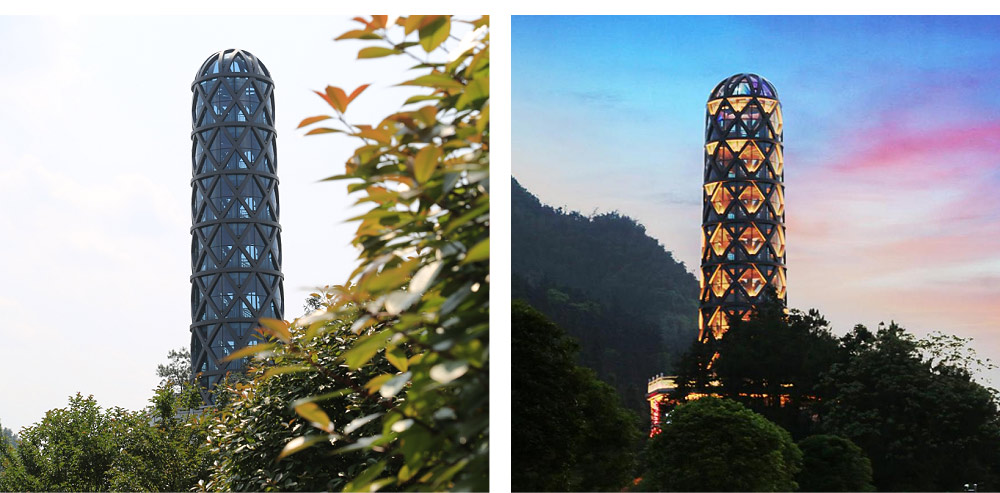 中國目前唯一的黑茶標志性景觀建筑。建成于2016年,總造價約450萬元,占地面積3500平方米,總建筑面積180平方米。景觀塔位于安化縣百里畫廊風光帶、白沙溪茶廠西側(cè)小山丘上,南抵省道S308線,北臨資江。塔高27.5米,共7層,由塔座和塔身兩部分組成。塔座呈八邊形,仿千兩茶底座設計,為前廳和設備層;塔身呈園形,仿千兩茶花格篾簍外觀設計,塔內(nèi)有螺旋式階梯而上,一至六層為游客觀光層,七層為茶室和接待室。景觀塔創(chuàng)作思路源于“世界茶王”千兩茶,景觀與觀景雙重功能結(jié)合,設計方案導入傳統(tǒng)塔式建筑的構(gòu)造特點,傳統(tǒng)文化諸如壯風水、鎮(zhèn)地脈、束水口、開文峰等意識形態(tài)為景觀塔鍍上一層神秘色彩。最有現(xiàn)實意義的是,該塔通體透亮,視野開闊,游客可信步登臨盤旋而上的扶梯逐層欣賞安化山形水色,領略白沙溪黑茶文化產(chǎn)業(yè)園區(qū)全景。每當夜幕降臨,千兩茶王景觀塔放射出絢爛光芒,格外美麗。有詩云:玉柱臨風,茶王展世界;步步高升,塔中看天下。