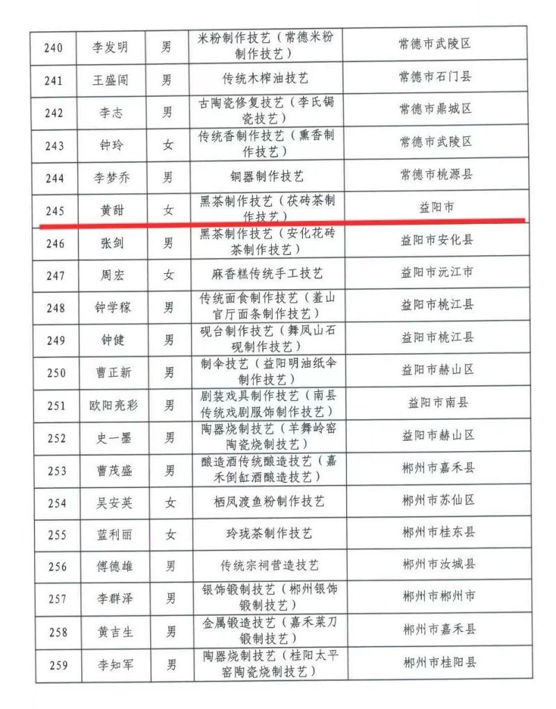 為深入學(xué)習(xí)貫徹習(xí)近平文化思想,加強(qiáng)非物質(zhì)文化遺產(chǎn)傳承人隊(duì)伍建設(shè),有效保護(hù)和傳承省級(jí)非物質(zhì)文化遺產(chǎn)代表性項(xiàng)目,根據(jù)《中華人民共和國(guó)非物質(zhì)文化遺產(chǎn)法》《湖南省實(shí)施<中華人民共和國(guó)非物質(zhì)文化遺產(chǎn)法>辦法》,參照《國(guó)家級(jí)非物質(zhì)文化遺產(chǎn)代表性傳承人認(rèn)定與管理辦法》要求,經(jīng)各地申報(bào)、專(zhuān)家評(píng)審、現(xiàn)場(chǎng)答辯、評(píng)審委員會(huì)審議、社會(huì)公示等程序,省文化和旅游廳確定了第五批省級(jí)非物質(zhì)文化遺產(chǎn)項(xiàng)目代表性傳承人名單(326人),其中集團(tuán)益陽(yáng)茶廠(以下簡(jiǎn)稱(chēng)益陽(yáng)茶廠)黃甜榮獲第五批省級(jí)非物質(zhì)文化遺產(chǎn)項(xiàng)目黑茶制作技藝(茯磚茶制作技藝)傳承人稱(chēng)號(hào)。